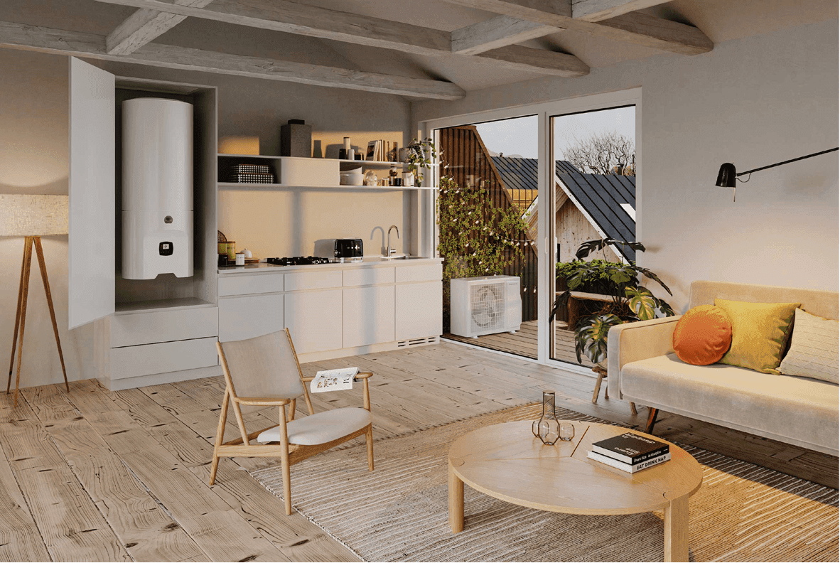 Opção recomendada para residências de nova construção ou reformas integrais, também para famílias que desejam substituir a caldeira por uma alternativa mais sustentável e 100% elétrica. As principais vantagens são a gestão integral proporcionada pelo sistema, o fornecimento abundante de água quente sanitária e a possibilidade de complementar o sistema com instalações fotovoltaicas.
